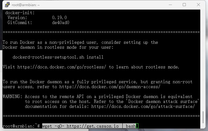 输入wget -qO- https://get.casaos.io | bash回车安装CasaOS如下图